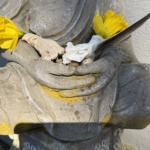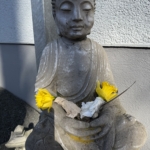 Die kinder haben Blumen mitgebracht, welche sie in den Schoß der Buddha Figur am Eingang zum Zen-Garten legten. Manche Kinder legten sogar einige Münzen in den Schoß.
